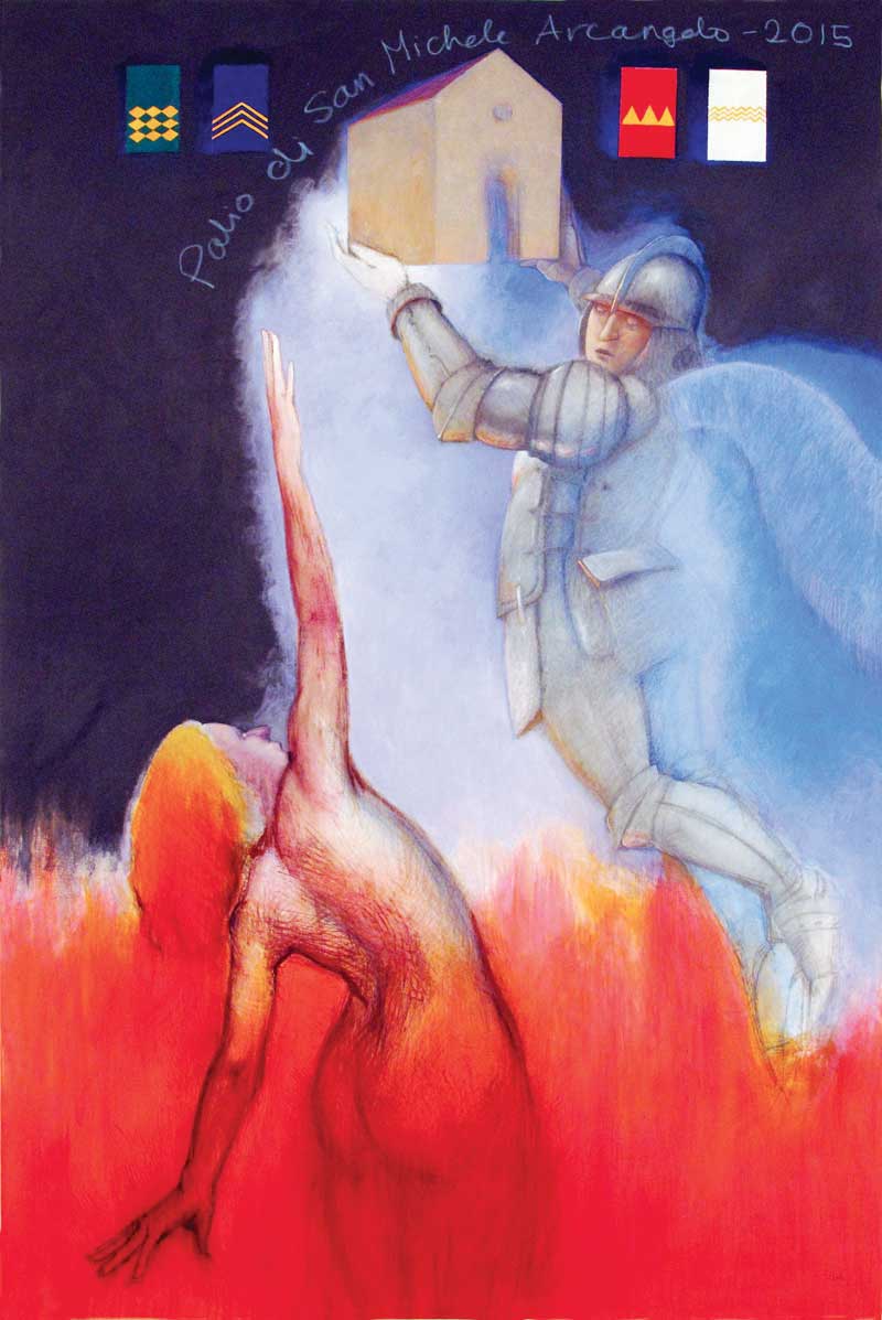 che Gualdo sarà risparmiata dalla sciagura e riconsegnata alla pace e all’ordine costituito. Al centro pertanto del drappo, dipinto in acrilico e grafite, la figura femminile, nuda, rappresentante la “strega”, avvolta dal fuoco rosso delle fiamme, mentre protende il braccio verso la Chiesa di San Francesco. Il San Michele invece, questa volta più guerriero che angelo,