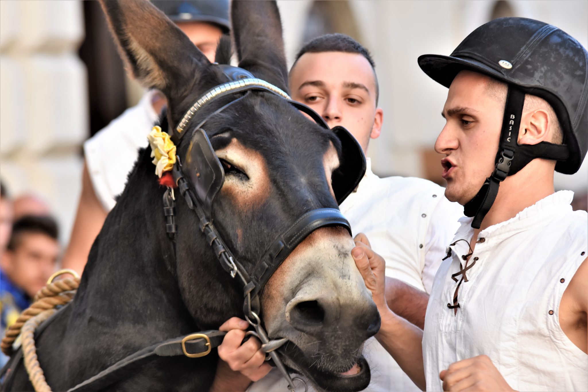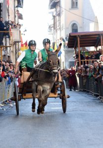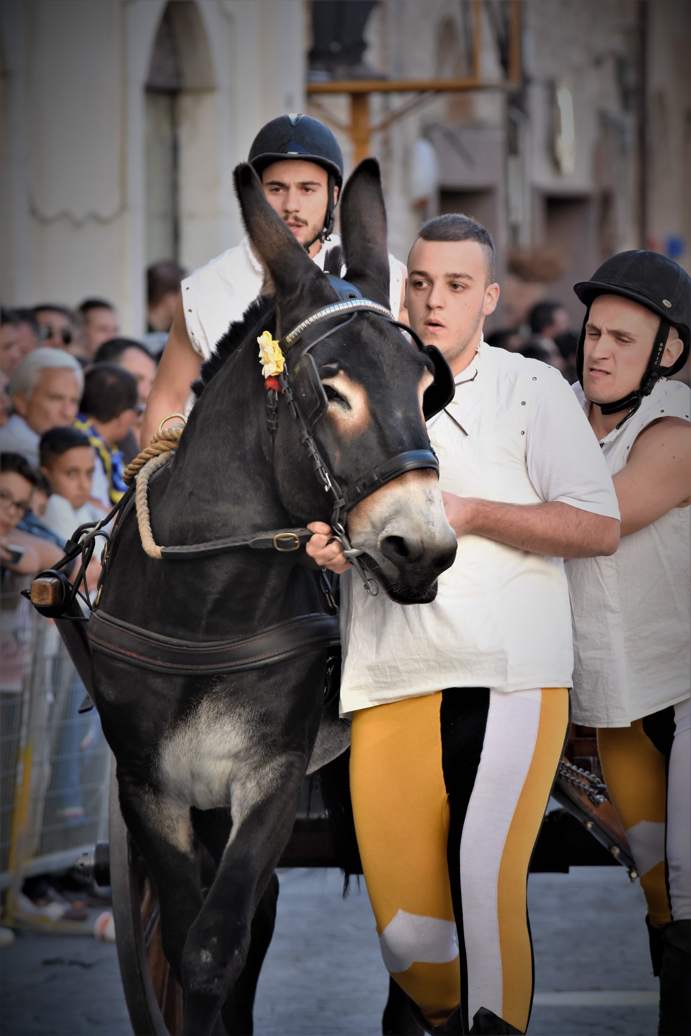 Un’incertezza di Intrigo, somaro di San Donato figlio dello storico Pirandello, poco dopo la partenza, pregiudica la gara della Porta giallo bianca che con l’auriga Mirko Gustinucci e il frenatore Luca Santini conclude e 2’09”. A chiudere San Martino con auriga Giovanni Pascucci e frenatore Paolo Micheletti su Bruno che chiude in 2’02” e 47 centesimi e per un soffio arriva davanti a San Benedetto. Dunque San Martino 12, San Benedetto 9, San Donato 6 e San Facondino 3.