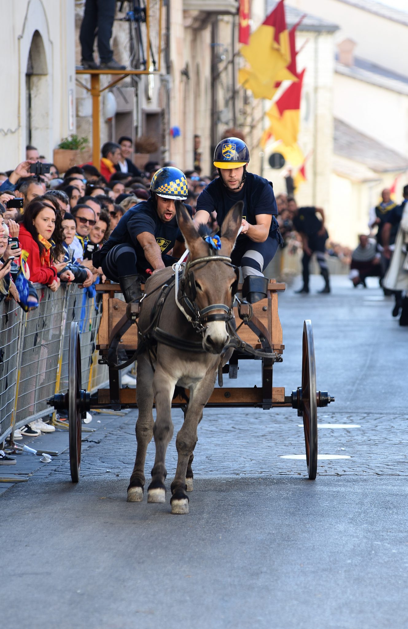 I Giochi si aprono con la corsa a carretto. San Benedetto con il somaro Gaspare condotto dall’auriga Simone Bordichini e dal frenatore Giacomo Pascolini realizza 2’02” e 65 centesimi. San Facondino torna in piazza con Indio con l’auriga Mattia Biagioli e il frenatore Simone Di Loreto che chiude a 1’58” ma la caduta del frenatore compromette la gara.
