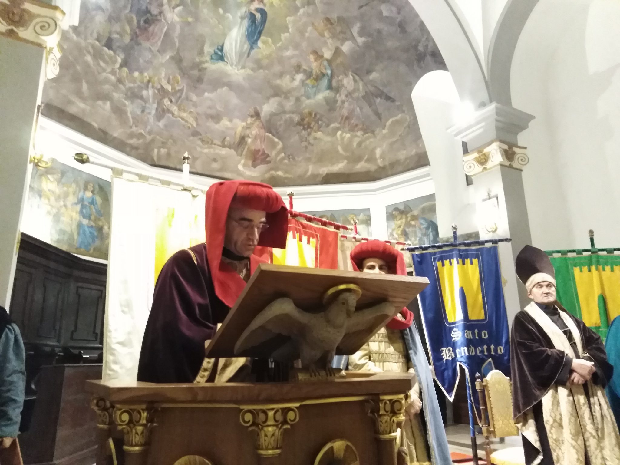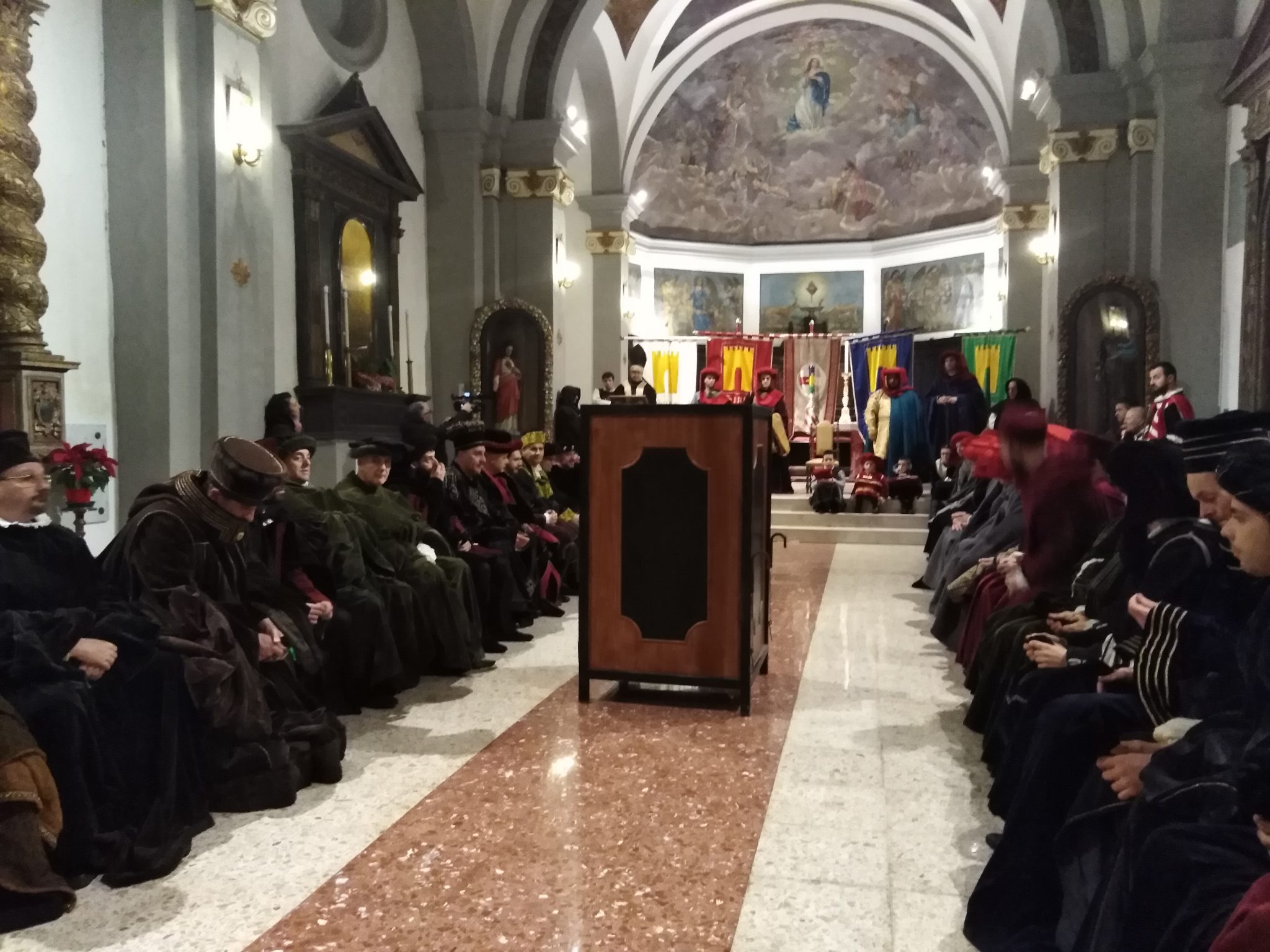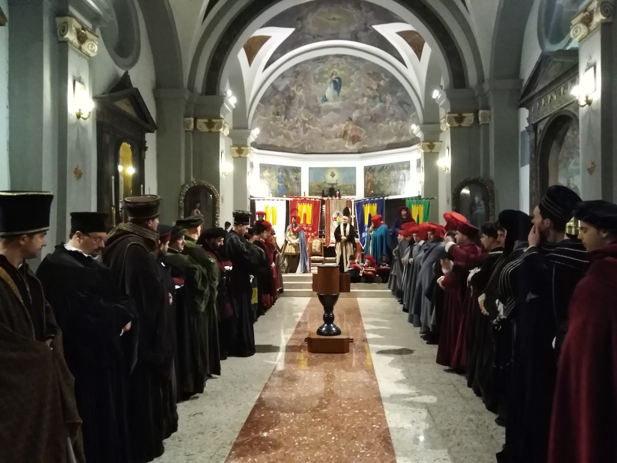 Un piccolo corteo storico, con partenza dal Palazzo Comunale di Gualdo Tadino, ha accompagnato i 48 membri del Consiglio verso la chiesa dove è stato poi eletto, con votazione segreta, il nuovo Gonfaloniere tra i Priori in carica e quindi Marco Brunetti Priore di Porta San Donato, Nicola Bossi Priore di Porta San Benedetto, Simone Saltutti Vice priore di Porta San Facondino e per l’appunto il neoeletto Gonfaloniere Andrea Farinacci Priore di Porta San Martino.